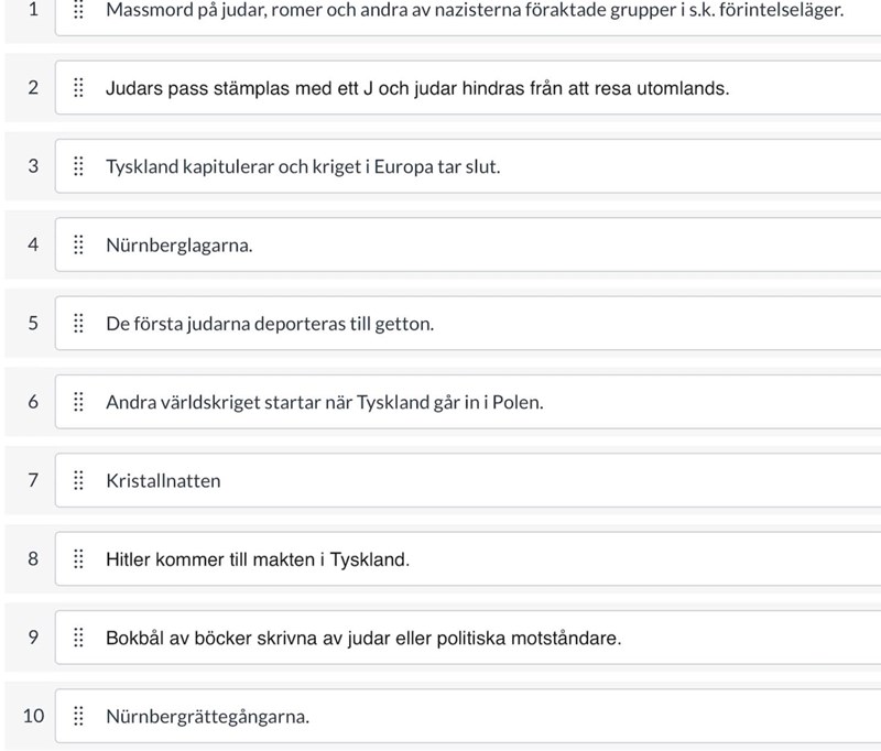 Hej! Har jag placerat händelserna i rätt ordning så de bildar en tidslinje över förintelsen? är väldigt osäker.