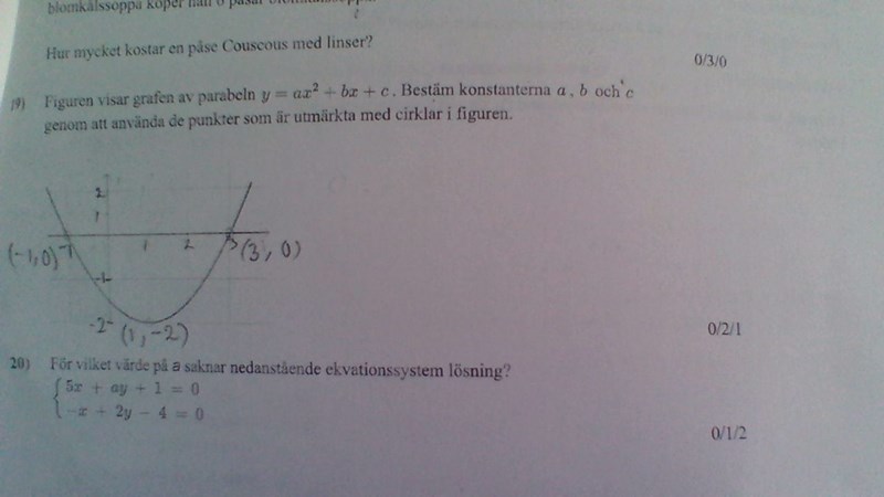 Hitta a, b och c av parabeln, då y=ax^2+bx+c