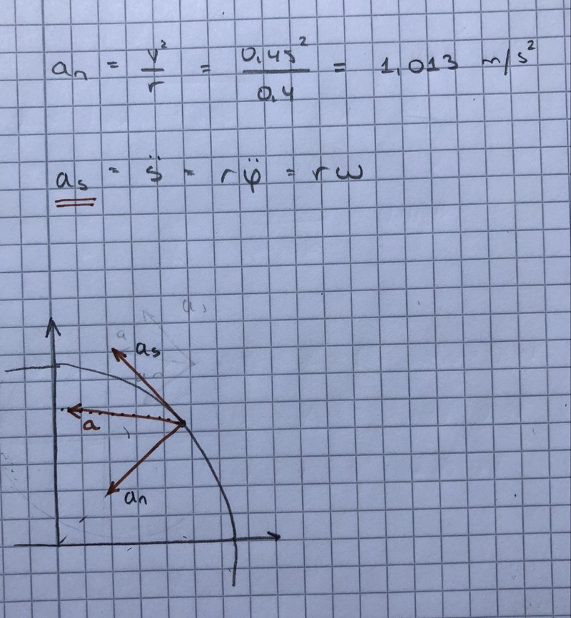 jag försöker lösa uppgiften: "En kropp rör sig medurs i en cirkulär bana med radien 400 mm. Då läget  φ=60° passeras är farten 0,45 m/s och den ökar med 0,6 m/s^2 . Beräkna accelerationsvektorns x- och y-komponenter i det aktuella läget"