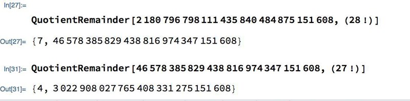 Jag säger att vi delar först med 28!, och delar resten med 27! osv? Är det nåt liknande?