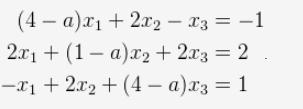 När jag kontrollerar a=-1 och a=5, så sätter jag in dessa värden i ekvationssystemet och ser efter vad som händer när man försöker lösa det på traditionellt sätt d v s utan matrisräkning. När du skriver symbolen "klammer 0 00  x klammer" så förmodar jag att det ska vara någon slags matrissymbol. Den har jag aldrig sett och jag tror inte den är gängse och vet inte vad den betyder. Teorin för att lösa ekvationssystem med matriser är i korthet följande: Koefficienterna i ekvationssystemet bildar en koefficientmatris M (i ditt fall en 3x3 matris). De obekanta x, x, ,, skriver vi som en kolumnmatris som vi kan kalla X. M uppfattar vi som en avbildning av vektorrummet V (i detta fallet R) in i V. Ekvationssystemet skriver vi då på formen  M(X) = A, där A är högerledet i kolumnform och M(X) betyder matrismultiplikation från vänster av M och X. Den inversa matrisen  M-1  existerar om och endast om det(M) är skilt från 0. M kallas reguljär om den har invers. Då kan man lösa systemet genom att ta  M-1 (M(X))= M-1 (A)   som ger  X = M-1 (A). Din symbol antyder att M-1 M skulle vara en nollmatris, men det(M)=0 medför inte att M måste vara en nollmatris. Jag tror att du gjort rätt men dina symboler föranleder viss (kanske onödig) tvekan.
