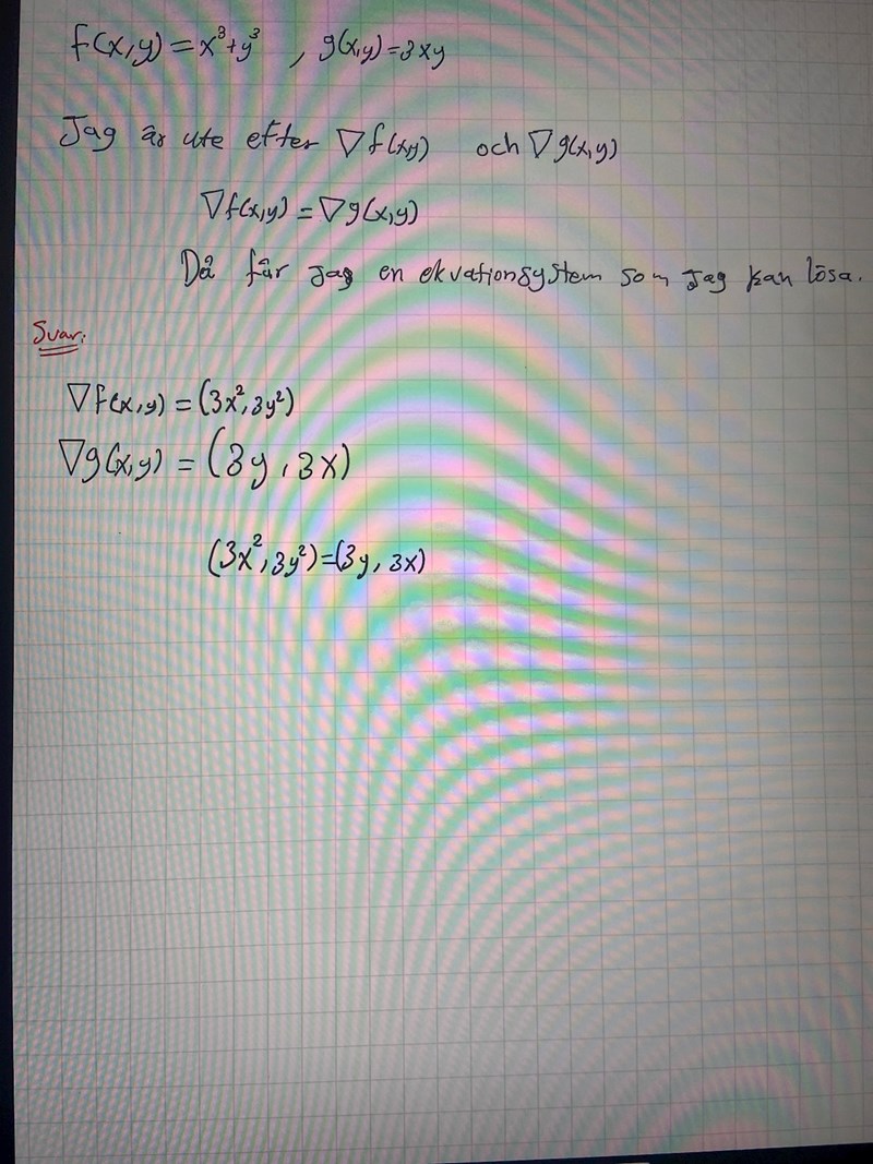 Hitta alla punkter i vilka funktionerna f(x,y)= x+y3 och g(x, y) = 3xy har samma gradient.