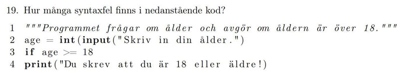 nu på rad tre har vi två fel, age är en string som inte kan jämföras med 18 samt inget kolon på slutet.
