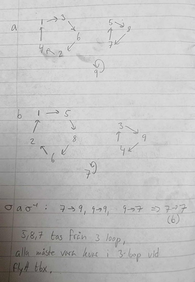 För att få konjugera måste och och ha samma cykelstruktur (och det har de ju, nämligen (vi struntar i den sista ettan eftersom den är överflödig)). Därmed kan vi med säkerhet säga att det finns åtminstone en permutation .