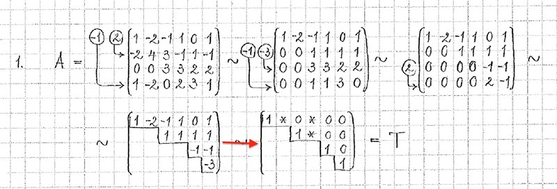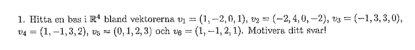 Länge sedan jag höll på med detta men kolumnerna 1, 3, 5, 6 har ettor. Då är v1 , v3 , v5 , v6 en bas. Om jag minns rätt. Men be mig inte bevisa det.