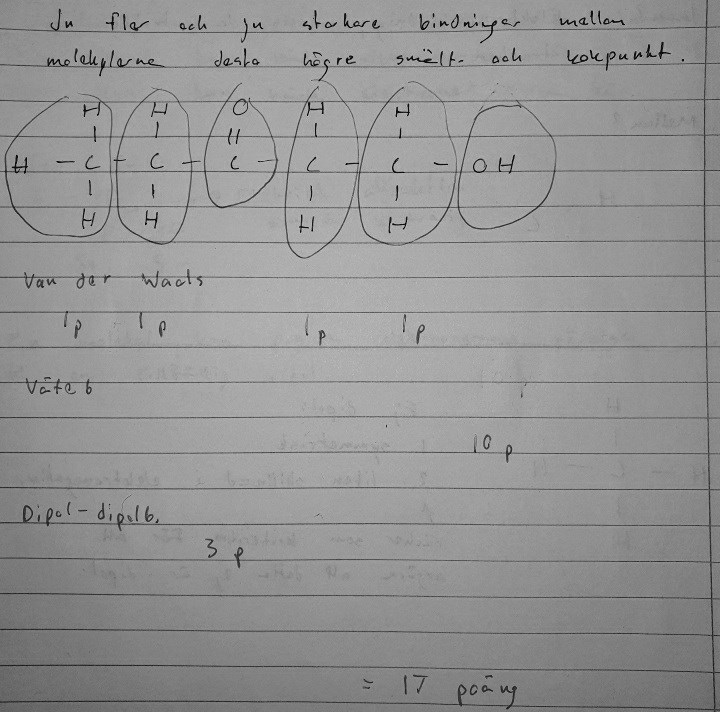 Min lärare har infört ett poängsystem där vätebindningar (starka) ger 10 p, dipol-dipolbindningar (svagare) ger 3 poäng och Van der Waalsbindningar (svagast) ger 1 poäng. Ju fler antal poäng en molekyl får desto högre smält- och kokpunkt kan man säga att ämnet har.
