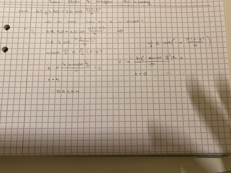Jag hittar en cosinus-lösning vid eller mellan 0=<t=<4, men det finns en till. Perioden är ju π/6 eller 30 grader. Så den är ju återkommande efter 30 grader, men hur många timmar är det? Jag vet att jag ska ställa upp ett uttryck för t=........+n*2π enligt cosinus grundekvation. Men hur ser denna ut?