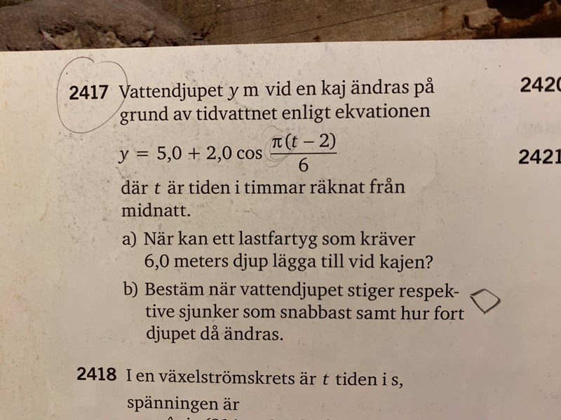 Smaragdalena skrev:Om vi har "standard-cosinusfunktionen" y = cos(x) där x anges i radianer, så är perioden . Om vi har funktionen y = kx där x anges i radianer, så är perioden . I det här fallet är . Vad blir perioden? Att högvattnet inte inträffar vid midnatt påverkar inte perioden.
