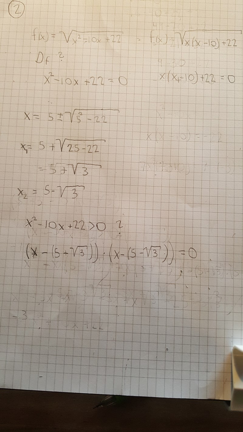 Hej! En rotfunktion sqrt(x) har defenitionsmängden från x>0 . Men när det står något annat än x inne i sqrt( ) gäller det att ha reda på vad x måste vara för att det innanför rottecknet ska bli 0 eller positivt. om då x^2 finns det två tal som ger 0 inne i rottecknet. Vilket tal är då det minsta talet som defenitionsmängden kan ha? Jag provade att ange det minsta av de två rötterna som svar x>= men det var fel.