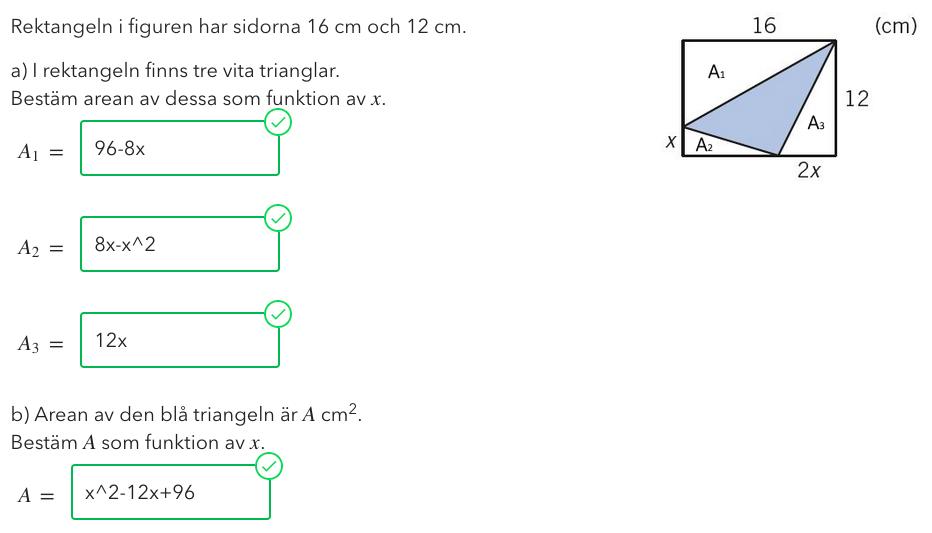 är ju giltig för x = 0 eftersom arean är positiv. Sedan kan ju inte x gå under noll då det blir utanför figuren.