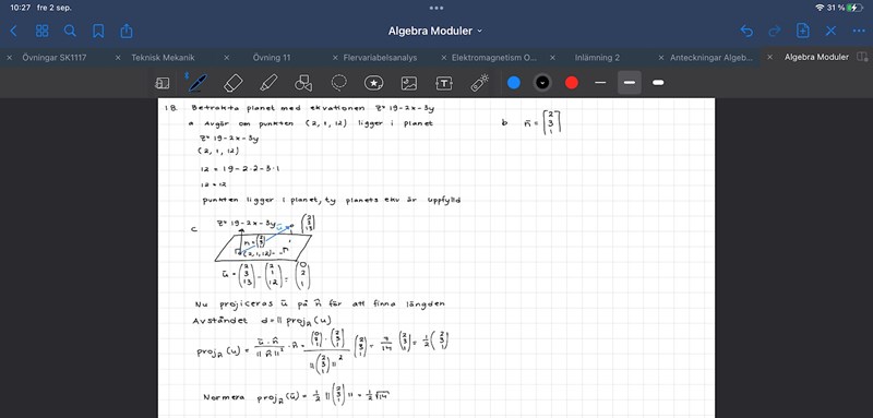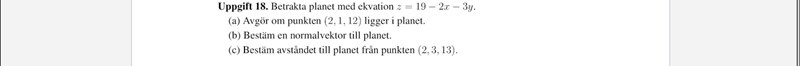 Hej, jag har gjort uppgift a, b, men c får jag inte rätt. Tänker att man ska projicera något på normalvektorn men får det inte att funka. Hur ska man tänka?