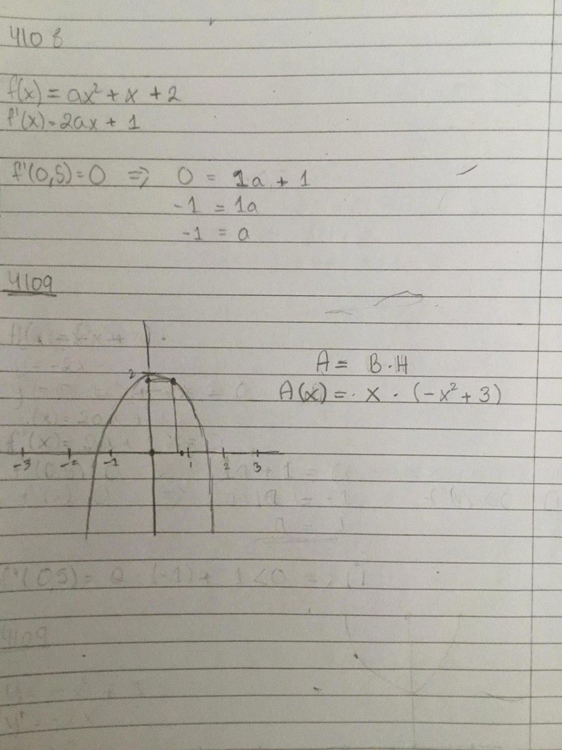 jag tänker så här: att jag borde hitta extrempunkten på funktionen eftersom den utgör den fjärde hörnet och kommer ge mig störst area, och sen därifrån räkna ut y värdet för extrempunkten. Och då kommer jag ha både x värdet som utgör längden och y värdet som utgör höjden och så räknar jag arean.