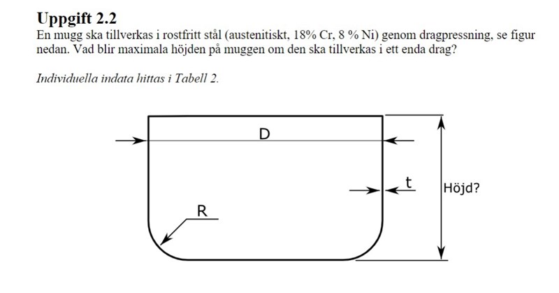 En mugg ska tillverkas i rostfritt stål (autentiskt, 18% Cr, 8 % Ni) genom dragpressning, se figur nedan. Vad blir maximala höjden på muggen om den ska tillverkas i ett enda drag?