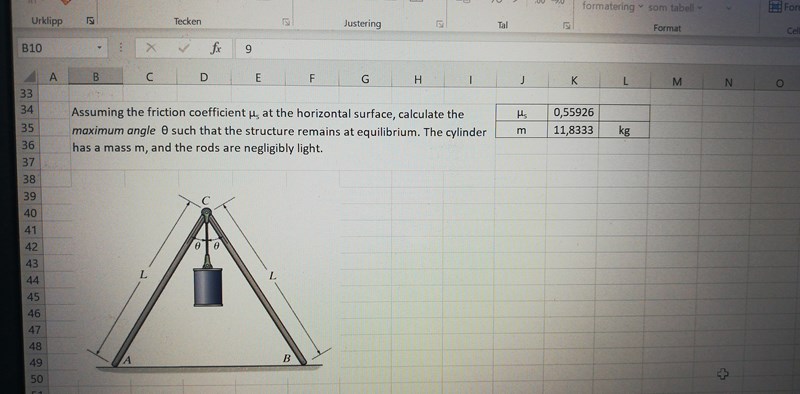 Hej! Jag har fått fram alla krafter i x och y led där jag även har tagit fram x o y led för stängerna. Men jag kommer inte vidare efter det. Det är för många okända...
