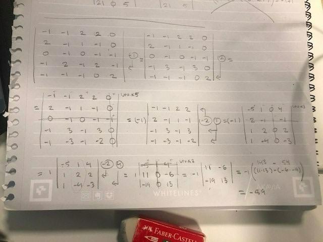 Hej, Jag försöker hitta determinanten. För varje gång jag löser så får jag ett annat svar. Svaret ska vara -29 men kommer inte fram till det. Min lösning ser såhär ut