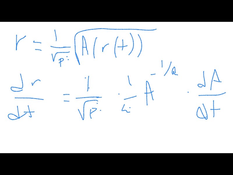 tänkte innnan att man implicit deriverade men då får man uttrycket för dA/dt och dr/dt man vill ju ha med Arean A i funktionen så det funkar inte försökte sedan räkna fram detta genom att först isolera radien ur uttrycket, så att man får den som en funktion av arean