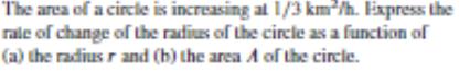 på b) menar de att vi vill uttrycka hastighetsförändringen av raden med avseende på tiden dvs dr/dt som en funktion av Arean av cirkeln