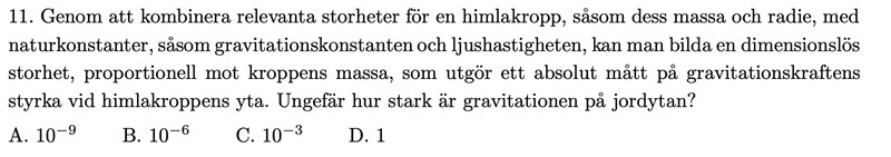 RandomUsername skrev:Jag ser felet, du gör. Du skrev jord radien som 6.3*10^3 fast den egentligen ska vara 6300*10^3. Därmed kommer det riktiga svaret bli 10^-3 gånger mindre och därmed får du A.