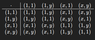 Jag kanske har tänkt fel för grupptabellen för den direkta produkten. För när jag ska hitta en isomorfi mellan de två grupptabellerna så ser jag att i den andra grupptabellen (för ) så har alla element ordning 2. Det gäller inte för den första grupptabellen. Måste inte ordningen vara samma för alla gruppelement för att en isomorfi ska finnas?