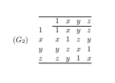 Boken har inget facit för uppgiften men har en tabell som visar de två distinka grupperna av ordning 4. Här är en av de: