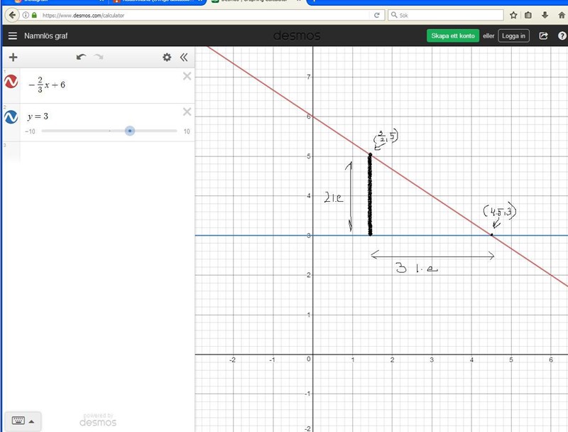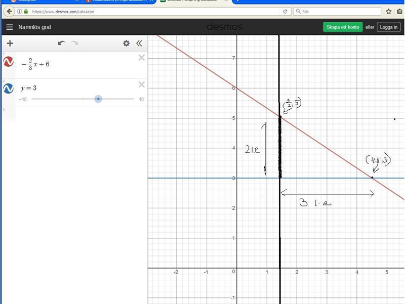 Funktionerna y1=-(2x)/3+6 och y2=3 kan ritas upp som två grafer i ett koordinatsystem. Hitta en tredje graf som tillsammans med funktionerna y1 och y2 bilder an triangel som har arean 3 areaenheter. Den okända grafen går genom punkten (3/2; 5).