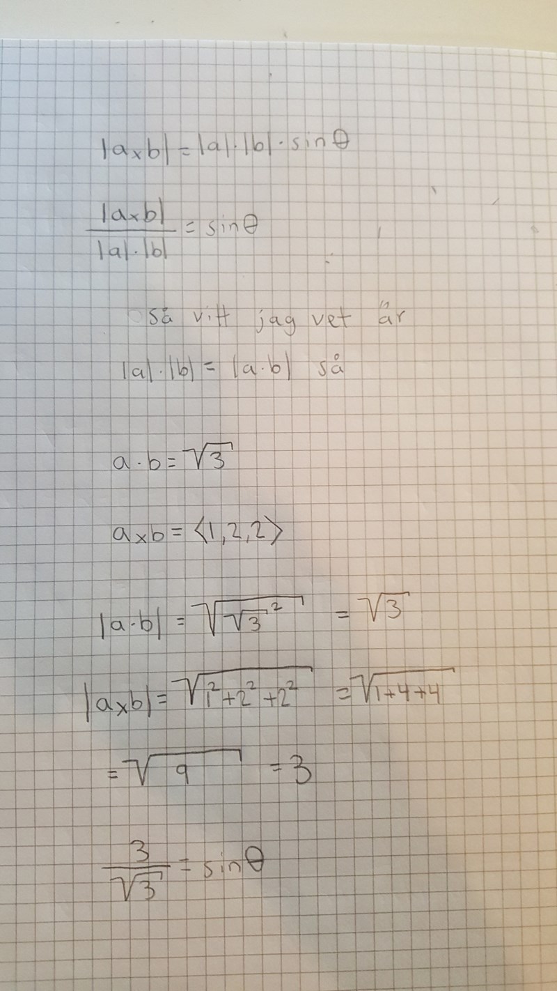 "If a*b= and ab= find the angle between a and b." Jag förstår inte varför min lösning inte fungerar: