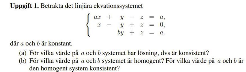 Jag har försökt få matrisen i trappform för att sedan kunna se vilka värden på a och b som ger lösningar. Men det blir väldigt komplicerade uttryck, det känns inte riktigt som att jag har tänkt rätt. Hur ska jag göra?
