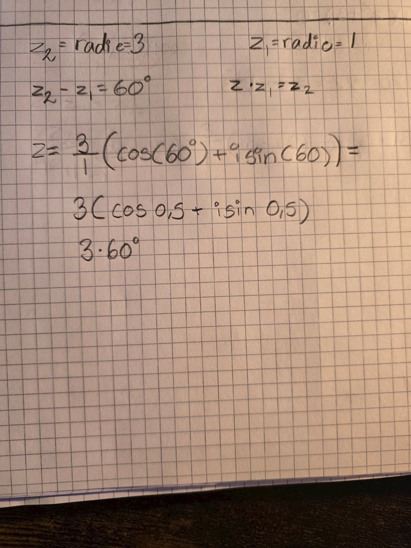 Vi får alltså z = 3(cos(60°)+i*sin(60°)) = 3*0,5 + i*