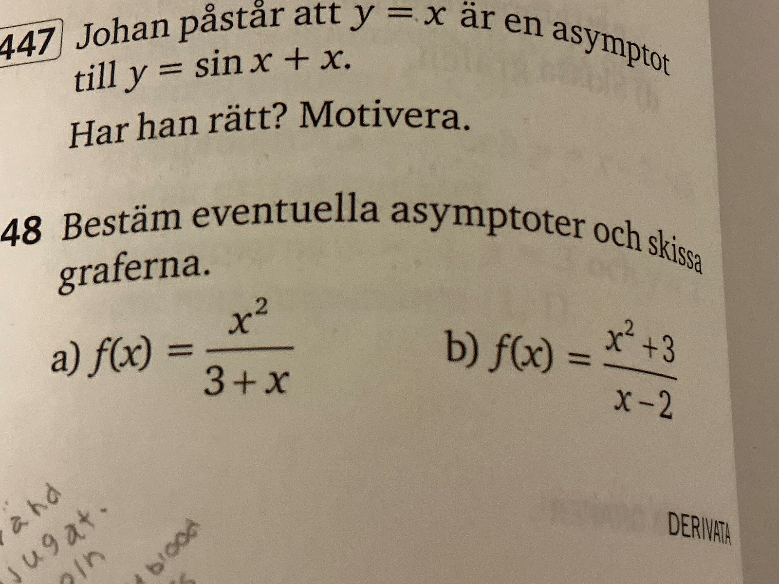 Ja, precis jag menar förkorta. alltså fungerar metoden enbart om man ska hitta horisontella asymptoter? Hur vet man om en graf har horisontella eller räta linjer på formen y = kx + m som asymptoter? Och hur menar med att bestämma k? Skulle du kunna ge ett exempel?