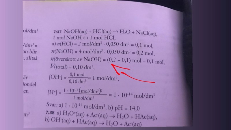 Varför tar man ut ”resten” dom blir kvar av substansmängden för NaOH för att räkna ut koncentrationen [OH-]? Varför kan man inte ta 0,1 mol HCl då den är mindre och begränsad i mängden? Och tar det delat på volymen totalt? Får jag inte ut koncentrationen vätejoner då?