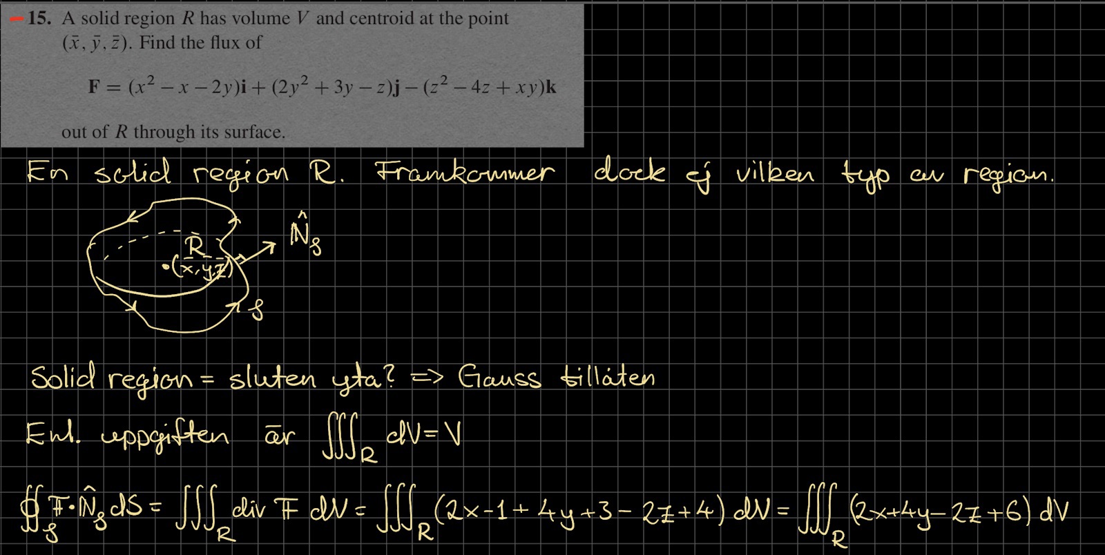 Hej, till uppgiften nedan har vi en region R med volym V, som tyder på att R är en sluten yta och att vi därmed kan använda oss av Gauss sats för att beräkna flödet.