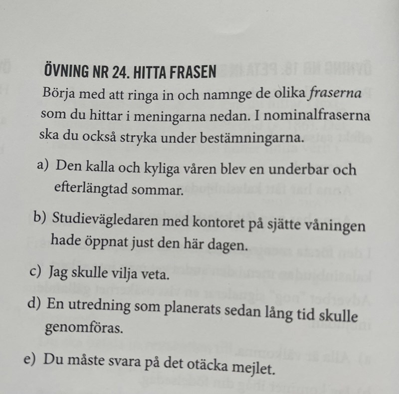 Hej! Jag har problem med att veta när en nominalfras slutar. Kolla gärna om ni håller med mina svar.