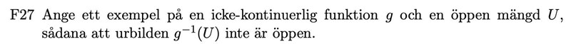 Hittar inte någon funktion som uppgiften söker. Tänkte att g=tanx skulle vara ett bra exempel, men den faller på att urbilden är öppen, eftersom den varierar mellan -pi/2 och pi/2 men antar aldrig pi/2 eller -pi/2 eller pi/2