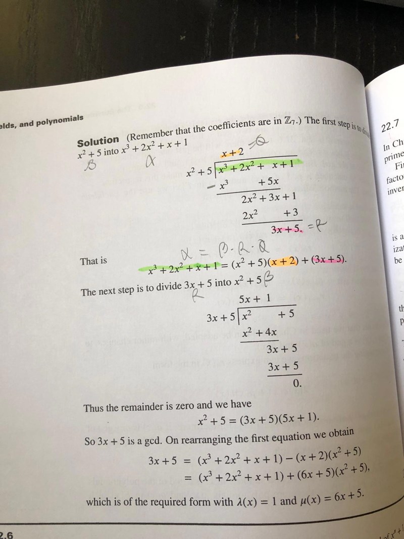 Micimacko skrev:Det ska vara minus framför hela uttrycket i en sån division. Alltså (x^3 + 2x^2 + x + 1)-(x^3+5x) = 2x^2-4x. Men eftersom du är i Z7 så skrev de inte -4x utan valde att plussa på 7x, och få 2x^2 +3x istället. Det hade du inte kunnat göra om du inte var i Z7, för med vanliga tal är ju inte 3 och -4 samma siffra, eller hur?
