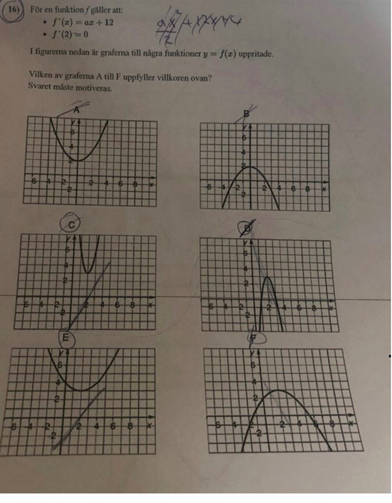 Sedan vet vi tex att f’(0) = 12, så där kan man plocka bort ytterligare alternativ.