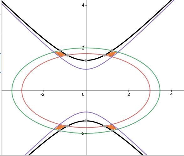 Gränserna hittar du genom att först sätta ekv1 och ekv3 i ett ekv. system av andra graden. Därefter ekv1 och ekv4, ekv.2 och 3 och slutligen ekv.2 och 4. Eftersom alla potenser =2, blir systemen inte särskilt svåra att lösa, men däremot tämligen tidskrävande. Latmasken gör nedanstående något vågade fundering. Vore väldigt roligt om du kunde kontrollera med den metod som jag tror du redan har valt. Blir det övermäktigt och du har tillgång till facit är en dålig människa lätt förledd.
