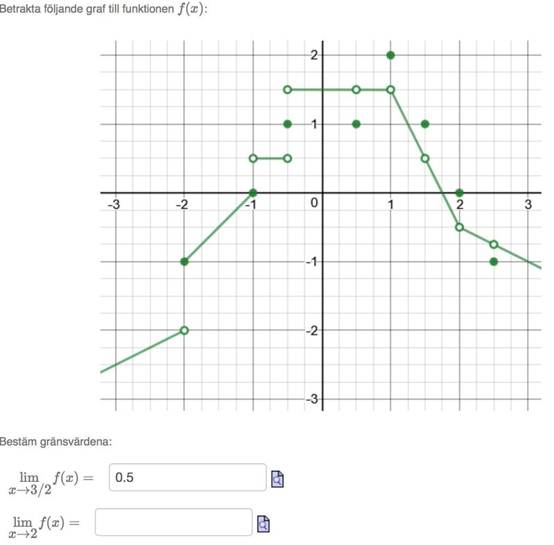 Var läser du av det? Jag får att linjen närmar sig punkten (2,-½) både när man kommer från vänster och från höger, men grafen visar att funktionsvärdet f(2)=0, inte ½.