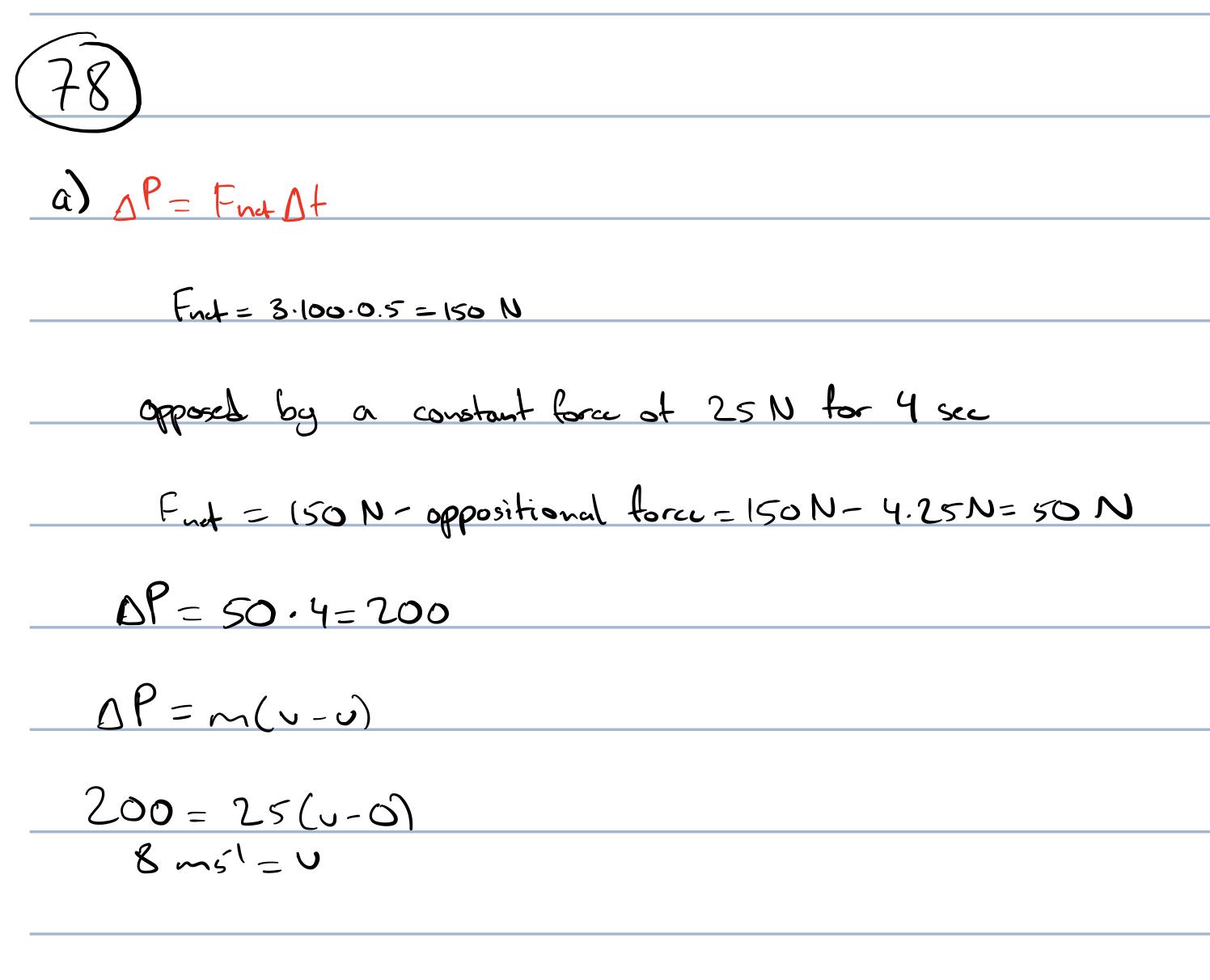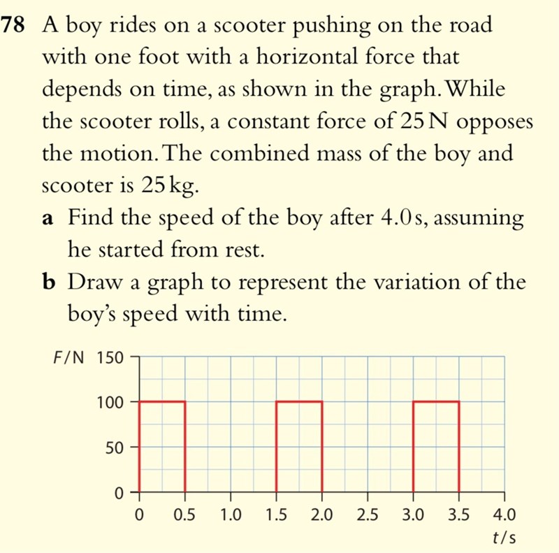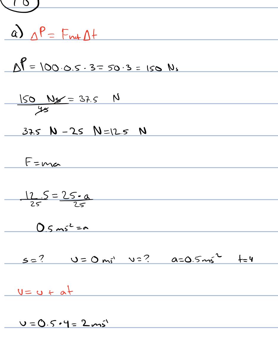 Jag skulle personligen inte lösa problemet på detta sätt utan jag skulle ritat upp F-t-grafen över den resulterande kraften dvs subtrahera 25 N från hela den givna grafen. Och från resultant-tid-graf göra beräkning av (a) och (b) med hjälp av impulslagen.