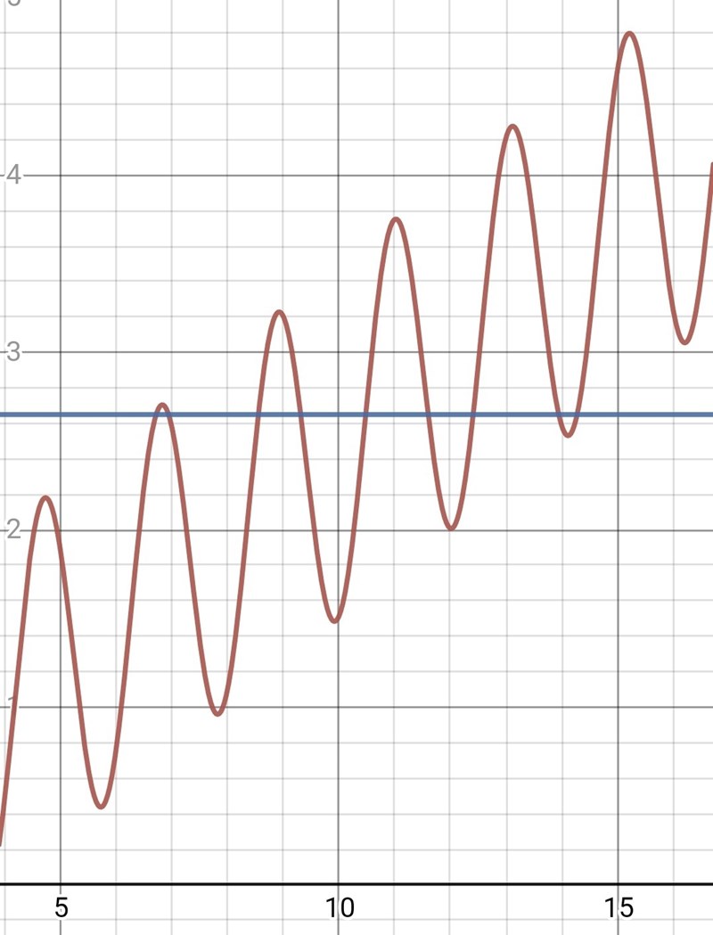 Så i den här uppgiften vet jag att man ska lösa med grafräknaren. Problemet nu är att det finns flera skärningar och jag vet inte hur man kan veta exakt hur många skärningar det finns eftersom när jag använder 'Intersection' på min grafräknare så kommer det endast upp en medan det finns flera bredvid varandra.