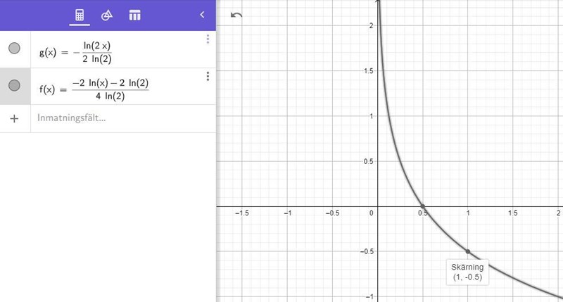 Fråga : Varför är det en skärning i geogebra vid (1,-1/2) ? Är inte h:y och g(x) samma graf?