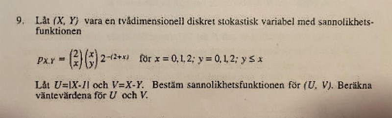 Det var tydligen fel väg att gå, transformationssatsen fungerar ej på diskreta stokastiska variabler, man skulle helt enkelt göra en tabell med alla olika utfall och motsvarande sannolikheter.