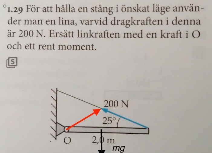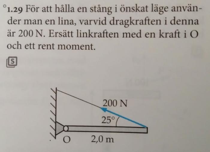 "För att hålla en stång i önskat läge använder man en lina, varvid dragkraften i denna är 200 N. Ersätt linkraften med en kraft i O och ett rent moment."
