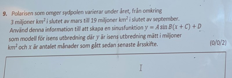Först listade jag ut värdena för A, B och D vilket inte var några problem. Jag fick att y = 8 × sin(π/6 × (x+C)) + 11. För att lösa ut C satte jag in koordinaterna (4, 3) eftersom polarisen uppnår 3 miljoner km2 vid slutet av mars (vilket är detsamma som början av april, d.v.s. månad nr 4). Värdet som fås för C blir då 5 + n × 12, n∈Z. Därav kan C t.ex. vara -7 som jag nämnde innan.