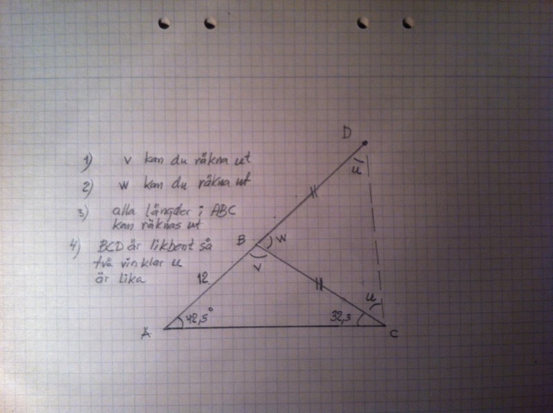 Man kan säga att jag kommit i typ en ”rundgång”. På en liknande uppgift tidigare gjorde jag en substitution, men här hittar jag ingenting som jag kan substituera med. För att hitta sträckan CD (som jag kallat S) så behövs antingen vinkeln u (vilken är okänd) eller vinkeln w som också är okänd. För att hitta w så behöver jag u och vice versa. Jag vet inte riktigt hur jag tar mig vidare med sinus-satsen! Säg till om min skiss är otydlig, isåfall ritar jag en tydligare :)