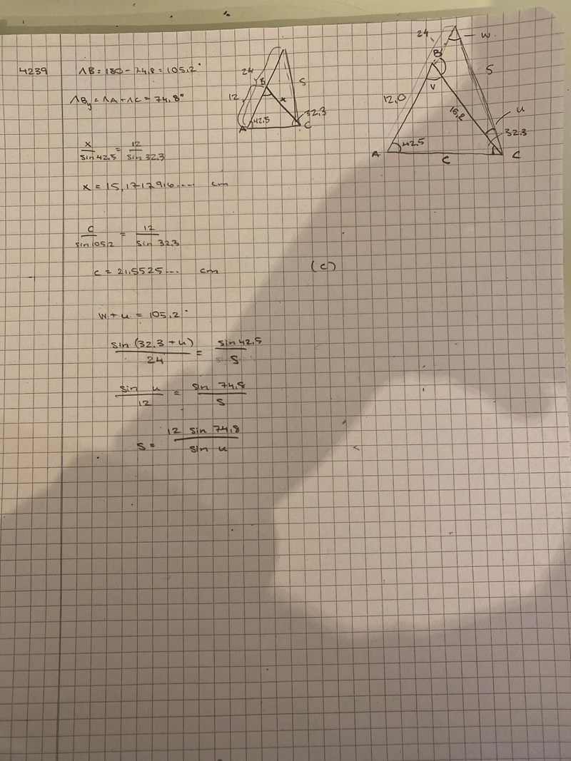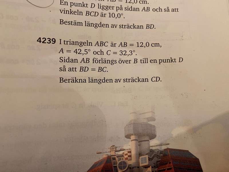 Hej! Jag hänger med fram till steg 4. Hur vet jag att triangeln med s som ”bas” är likbent? Enligt sinussatsen får jag motsvarande sträcka i triangeln ABC till 15.2?