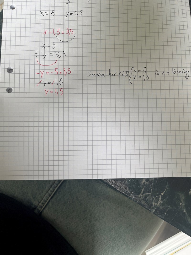 Alltså är Sannas lösning inte korrekt.Om man löser ut x ur den första ekvationen får man x = 3,5+y. Insättning av detta i den andra ekvationen ger 2(3,5+y)+y = 5,5 => 7+2y+y = 5,5 => 7+3y = 5,5 => 3y = 5,5-7 => 3y = -1,5 => y = -0,5. Sätter man in detta y-värde i den första ekvationen får man x-(-0,5) = 3,5 => x = 3. Koll: sätt in x och y i den andra ekvationen: VL = 2x+y = 2.3+(-0,5) = 6-0,5 = 5,5 = HL.