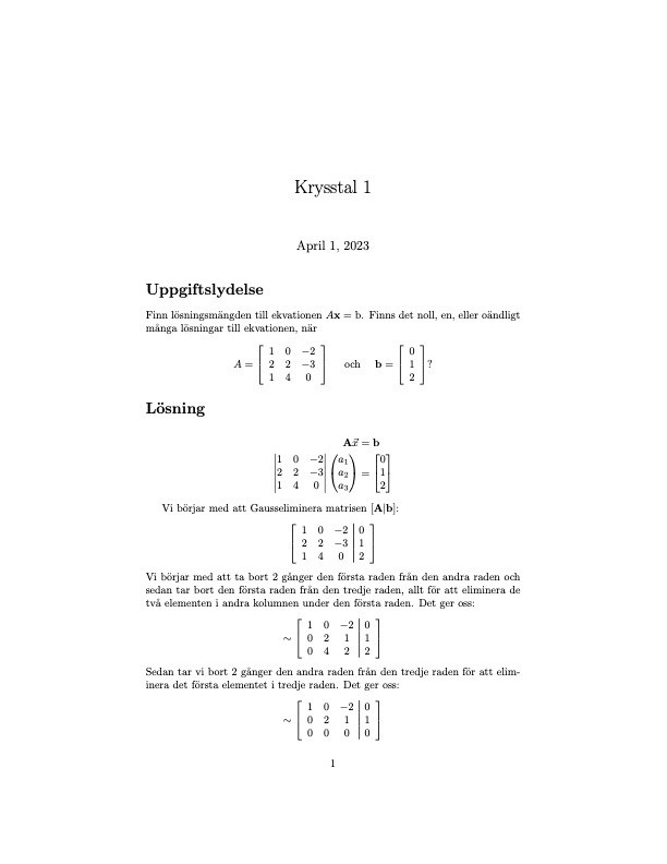 Jag behöver hitta lösningsmängden för Ax=A \mathbf{x}= b då ovanstående matrisekvationer gäller, och bestämma om det finns en, flera, eller noll lösningar.