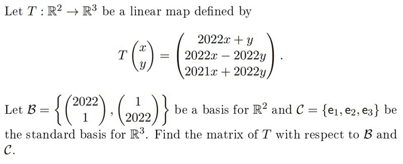 Jag vet att det finns teorin om att låta V och W vara vektorrum med baserna B och C, då är T en linjär transformation och då satisfieras matrisen A [v]_B = [ T(v) J_C för varje vektor V i V. Så vi vet att A[V]_B = [T(v)]_C