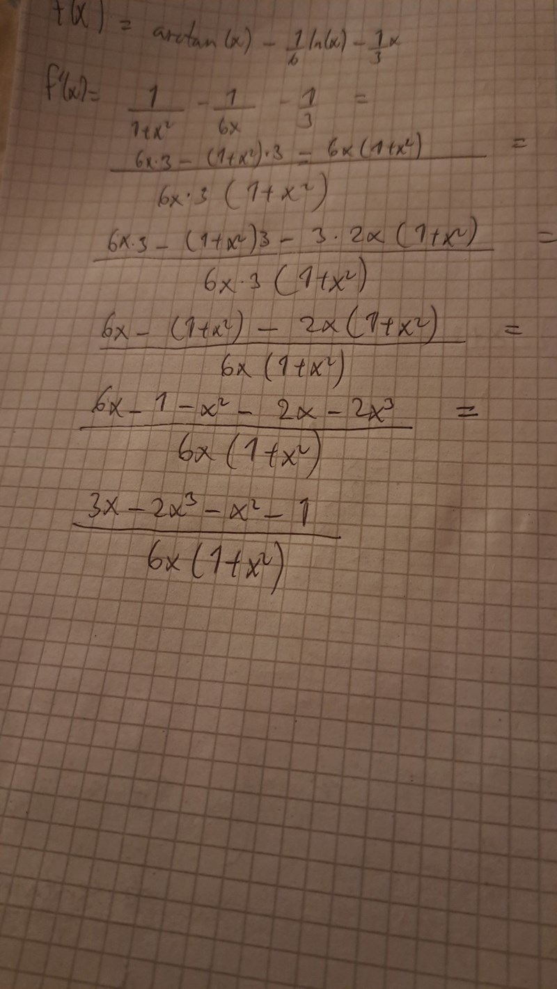 Funktionen är f(x) = arctanx - (1/6)lnx - (1/3)x.