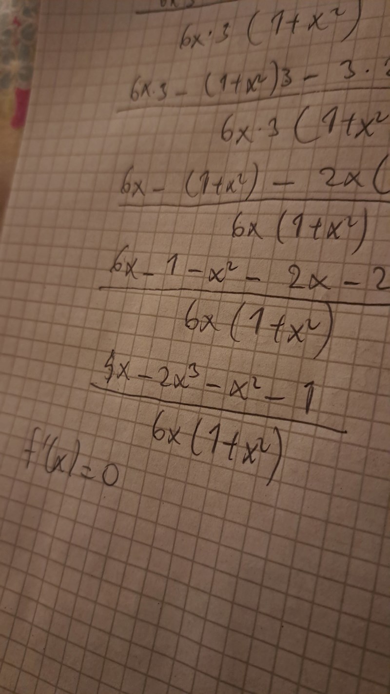 Nu börjar det bli rörigt här, men första termen i täljaren sista raden får jag till 4x och inte 3x